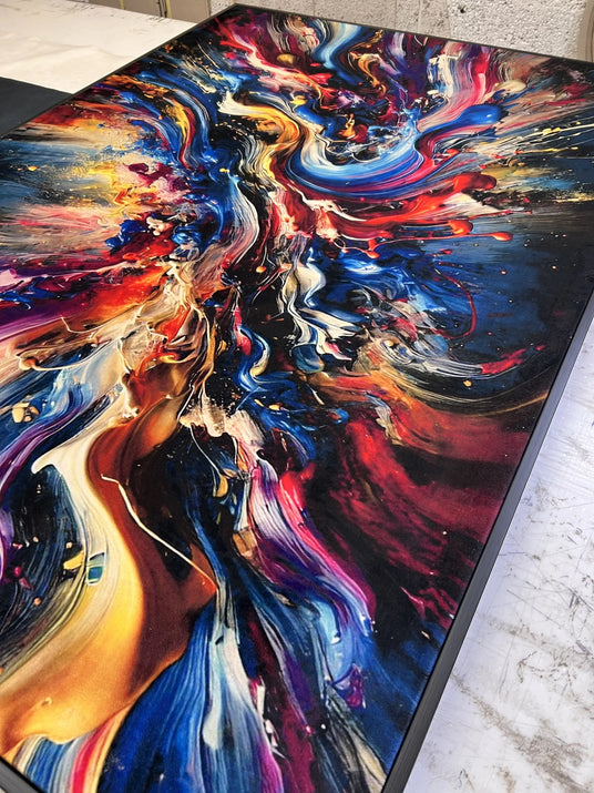 Once printed, every artwork is carefully stretched, mounted, and framed by hand, ensuring a perfectly finished product that exudes sophistication. The result? A striking, tactile experience, where art is no longer just seen but felt.