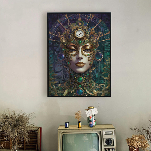 The background bursts with deep emerald, amethyst, and silver hues in a mosaic of impressionist brushstrokes, while the distant silhouette of vintage clocks and gears hints at the secrets of time. Inspired by Afrofuturism, this artwork captures a harmonious blend of past and future, creating a serene yet captivating atmosphere.